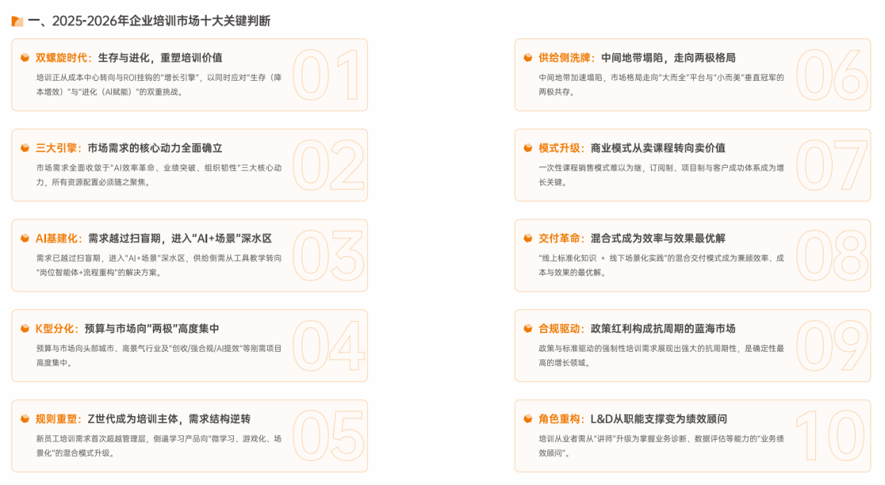 混沌时代,清晰的认知是最宝贵的资产。白皮书通过穿透式分析,提炼出定义未来两年企培业走向的十大关键判断,为从业者拨开迷雾: